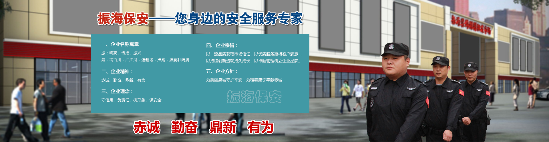 山東振海保安服務(wù)有限公司是一家專業(yè)的保安服務(wù)公司,提供人防安保、臨時(shí)勤務(wù)安保、危機(jī)處理安保、犬防安保、反跟蹤、調(diào)查、商業(yè)間諜等服務(wù),公司成立于2015年5月,是通過國家公安部門資質(zhì)認(rèn)證,經(jīng)山東省公安廳和濟(jì)南市工商局批準(zhǔn)成立的綜合性民營保安公司。公司立足濟(jì)南,面向山東省內(nèi)外,開展的業(yè)務(wù)涵蓋人防、技防、安檢、守護(hù)、隨身護(hù)衛(wèi)、大型活動(dòng)特勤等安保項(xiàng)目。公司總部坐落于濟(jì)南市市中區(qū)英雄山立交樞紐南側(cè)振海裝飾材料市場大樓;公司培訓(xùn)基地位于濟(jì)南市南部山區(qū)。